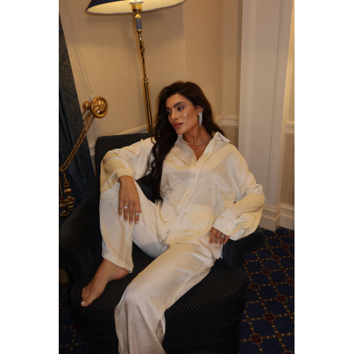 Домашній костюм зі стразами з преміального сатину поєднує комфорт і делікатний акцент сяйва.